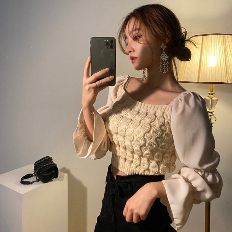 新品 スタンダードスリーブシフォンセーター レザースカート レトロ スクウェア ステッチ ⦿韓国 オルチャン K-pop アイドル ジャケット スーツ ワンピース カーディガン ニット フーディー トレーナー キャミソール スカート シャツ ブラウス 5A0009595 | K clothig adult