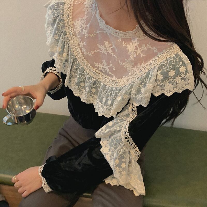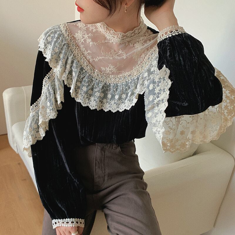 ❖KOREAレースベルベットシャツブラウストップス ロング レトロ ステッチ ❖ 韓国 オルチャン K-pop アイドル ジャケット スーツ ワンピース カーディガン ニット フーディー トレーナー キャミソール スカート シャツ ブラウス 5A25754625971 | K clothig adult