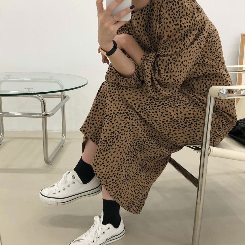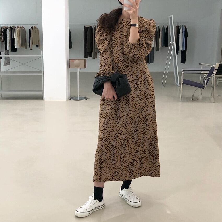 ❖レオパードマキシワンピースドレスOP ラウンドネック ロング カジュアル 長袖スリーブ プリント柄 レトロ ❖ 韓国 オルチャン K-pop アイドル ジャケット スーツ ワンピース カーディガン ニット フーディー トレーナー キャミソール スカート シャツ ブラウス 5A95105849089 | K clothig adult